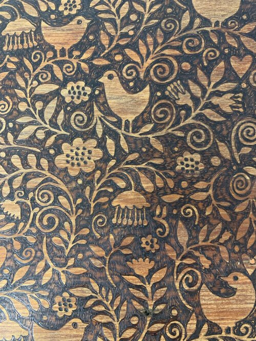 I especially like working on commissions. Creating a very personal piece, makes me very happy and I get a thrill out of people’s reaction to what I created for them. In most cases I need to source the piece to work on for the commission, but I am happy to work on a piece you own, I then create a design for your approval before I burn or etch. Sending the first photos of the finished piece, I hold my breath until I hear the customer loves it. I can then relax and enjoy the warm glow of having achieved an appreciated artwork.